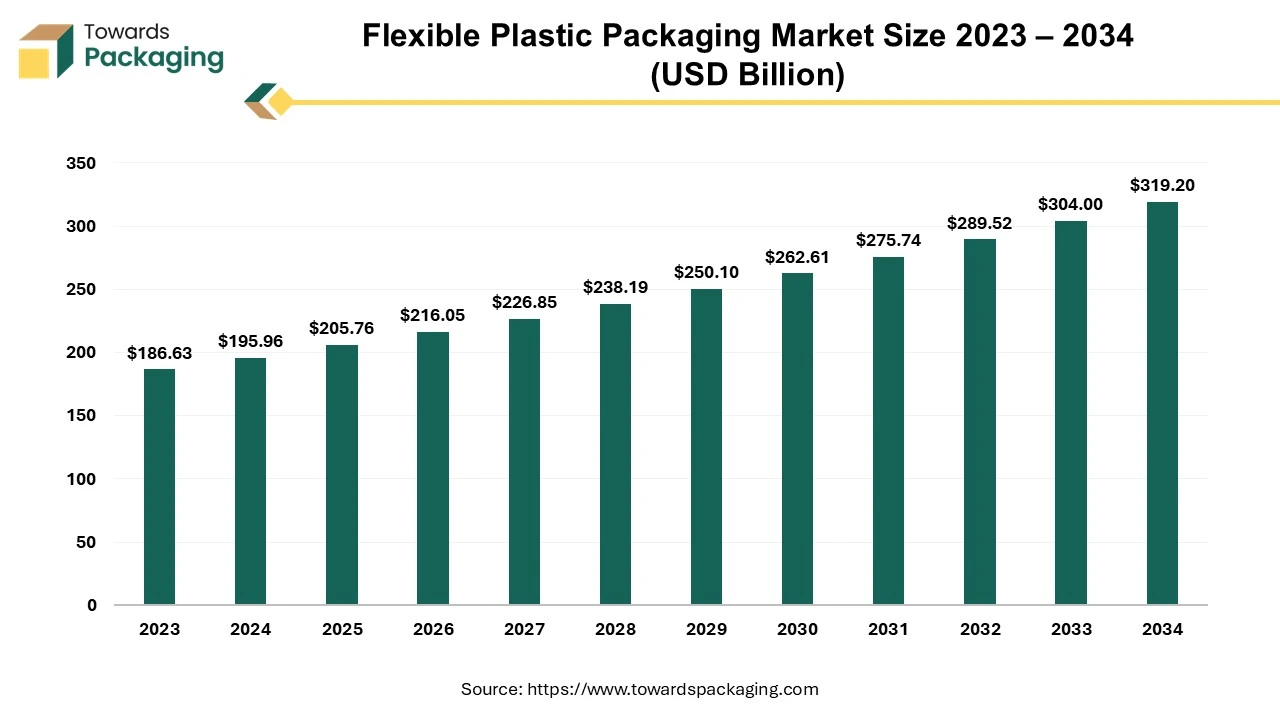 According to researchers from Towards Packaging, the global flexible plastic packaging market, estimated at USD 205.76 billion in 2025, is forecast to expand to USD 319.20 billion by 2034, growing at a CAGR of 5.0% over the forecast period.